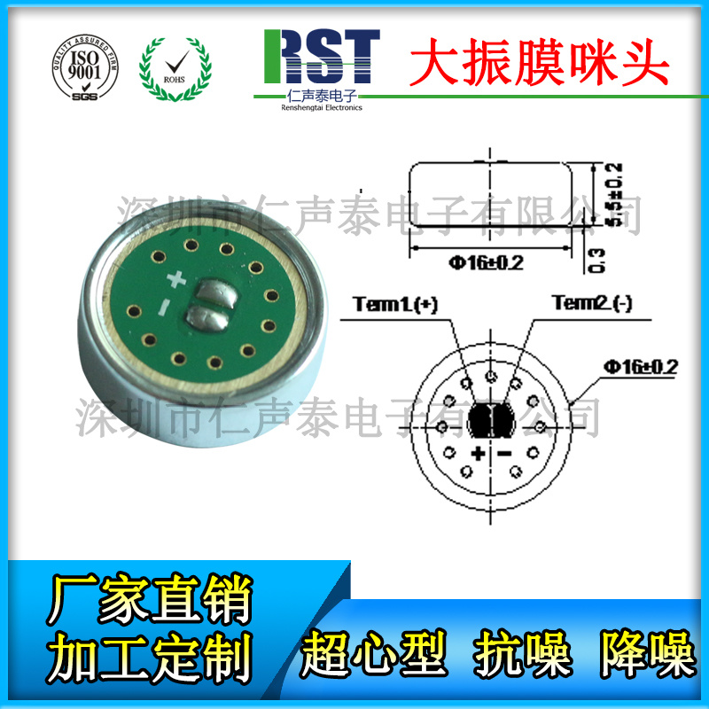 ★产品尺寸:Φ16.0*5.5mm ★产品特点:背极式 驻极体 单指向、双屏蔽咪头, ★产品描述:进口管芯,拾音效果强,音质好,指向性明显,保真度高。 ★应用领域:主要用于高端会议系统、采访、主播、K歌麦克风、高端摄影机。