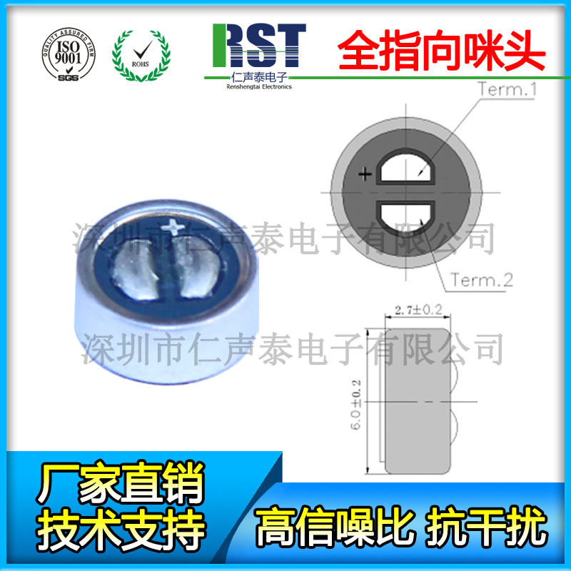 ★ 产品尺寸:Φ6.0*2.7mm ★ 产品描述:B6027AL-SKN 背极式 驻极体全指向咪头 抗干扰 低噪音 高灵敏度 ★ 产品特点:抗干扰、音质好、不易啸叫、高保真。 ★ 产品应用:可用于领夹麦客服、录音笔、警用执法记录仪、行车记录仪、无线录音设备、KTV、头戴麦、迷你麦克风、车载蓝牙、车载免提等高端设备。灵敏度范围可根据客户不同要求调整。