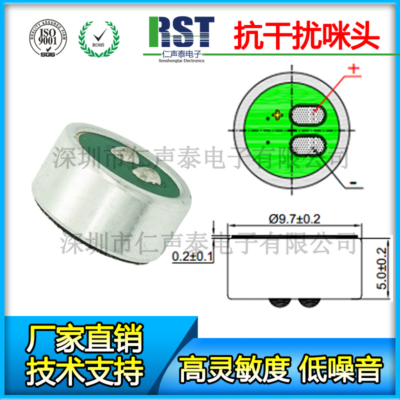咪头名称 9750全指向咪芯 咪头指向性 全指向 咪头规格 φ9.7*H5.0mm 咪头类型 驻极体电容咪头传声器 灵敏度 可根据客户要求定做 输出阻抗 2.2KΩ